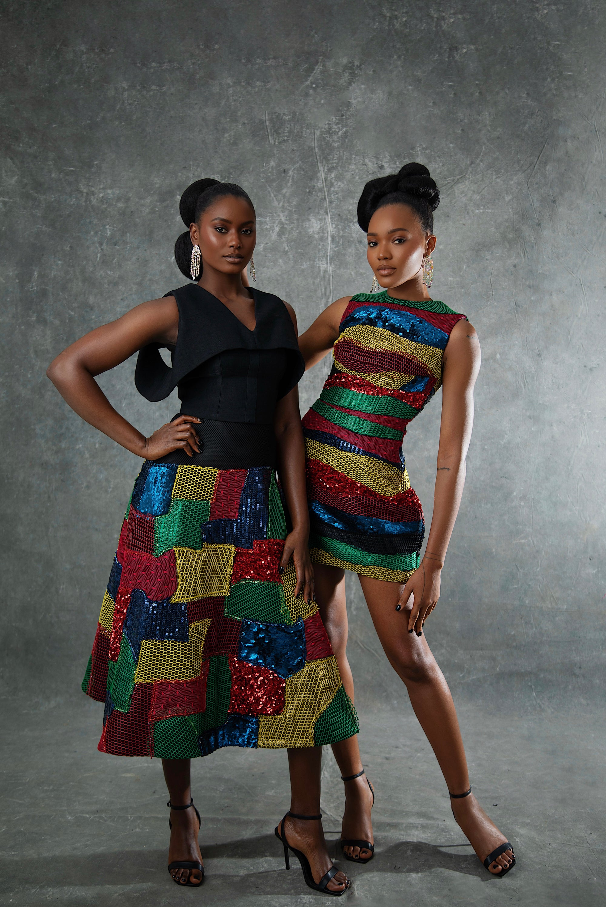 Heritage weaves, mesh overlays, feathers, beadwork, and digitally customized graffiti come together in vibrant, expressive compositions — each piece hand-crafted by our atelier in Lagos.